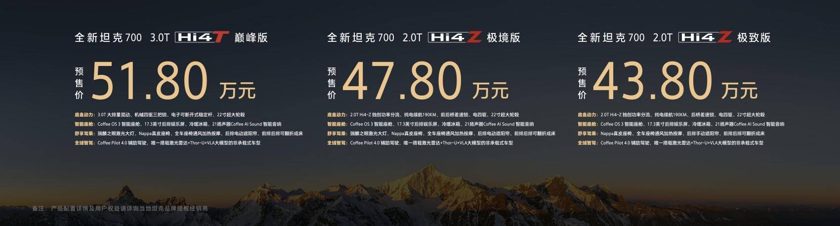 凤凰网科技讯 4月9日,坦克品牌昨日宣布全新坦克700将于4月20日上市。全新坦克700已在3月30日开启预售,新车推出3.0T Hi4-T、2.0T Hi4-Z两大动力版本共3款车型,官方预售价区间为43.80万-51.80万元。