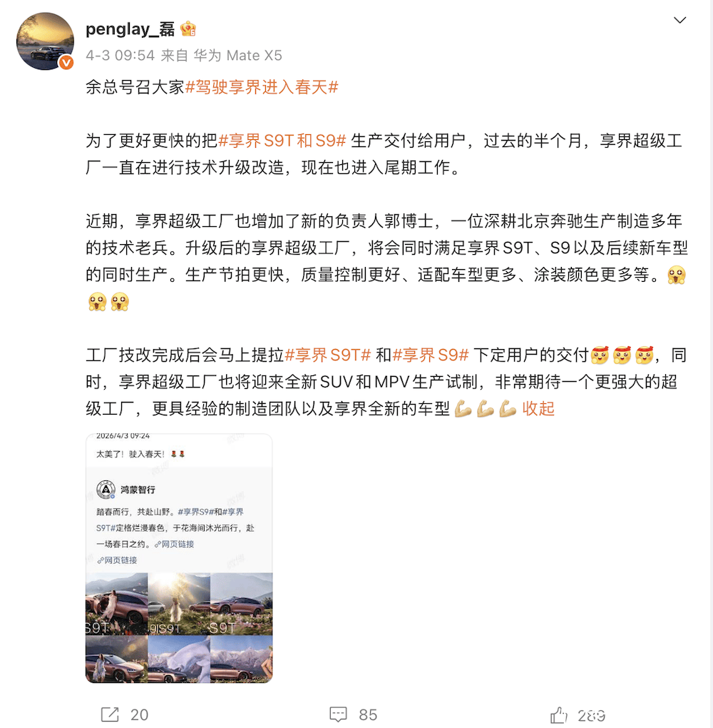 来到4月份,华为智选车产品总监(享界系列)彭磊在微博透露,享界超级工厂技术升级进入尾声,待技术改造完成后,将会马上提拉享界S9/S9T下定用户的交付。彭磊也确认,享界将迎来全新SUV和MPV车型的生产试制。